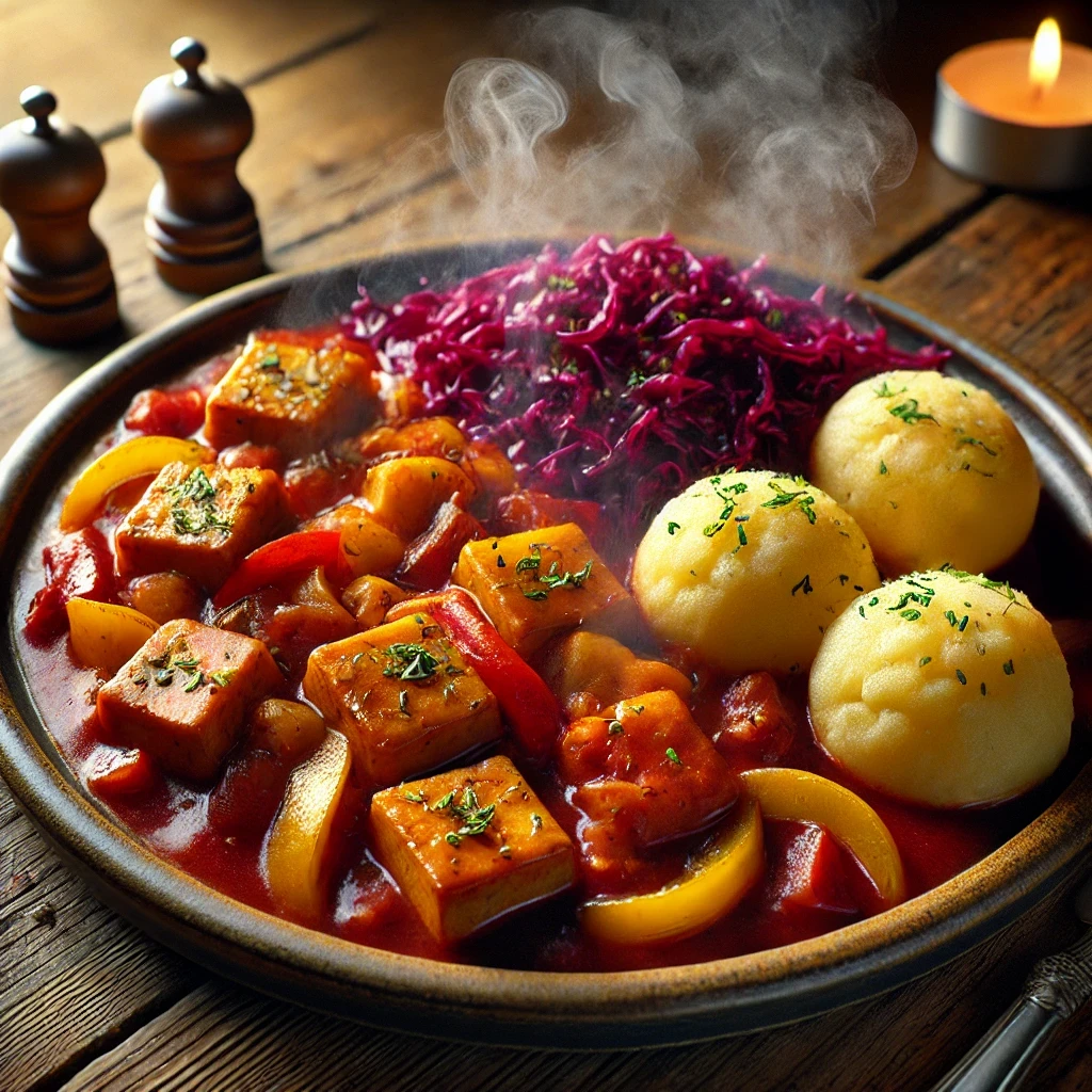 Du liebst deftige Hausmannskost, aber dein Magen sagt “bitte ohne Kuh”? Kein Problem! Dieses Tempeh-Gulasch bringt genau die herzhafte Würze und den Schmelz, den du dir von einem klassischen Gulasch wünschst – nur eben mit fermentierter Power statt Rindfleisch. Serviert mit fluffigen Knödeln und samtigem Rotkohl ist das hier Soulfood deluxe.